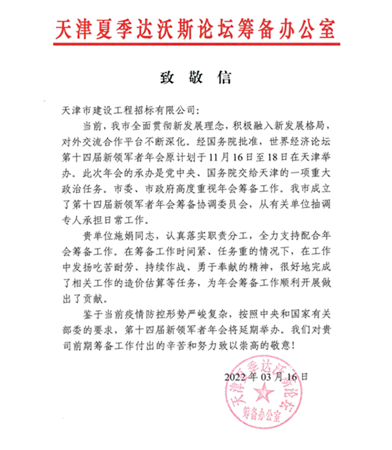 日前,天咨公司所屬招標(biāo)公司收到天津夏季達(dá)沃斯論壇籌備辦公室發(fā)來(lái)的致敬信,充分肯定了招標(biāo)公司為天津夏季達(dá)沃斯論壇年會(huì)籌備工作所作的積極努力。