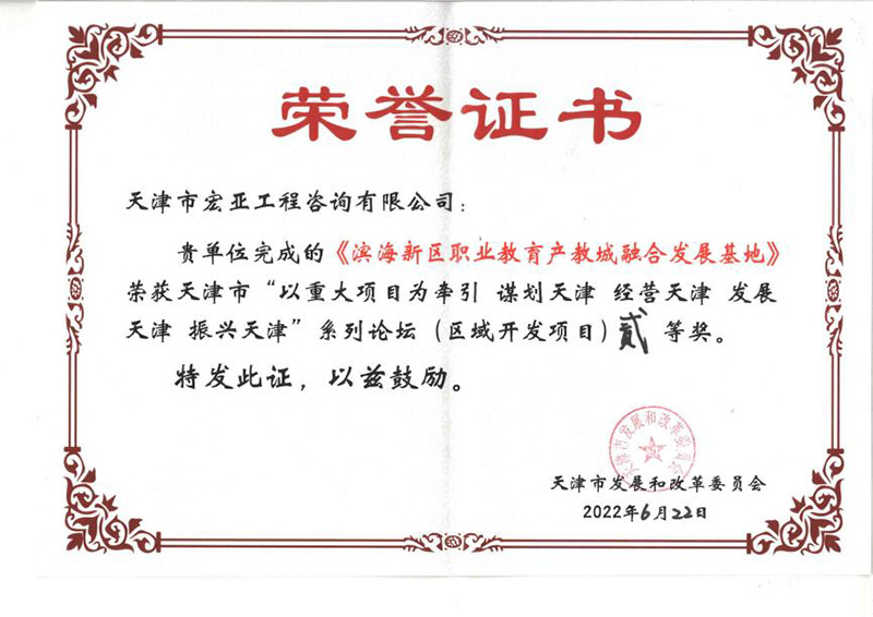 基地》項目榮獲天津市發(fā)展和改革委員會頒發(fā)的天津市“以重大項目為牽引 謀劃天津 經營天津 發(fā)展天津 振興天津”系列論壇(區(qū)域開發(fā)項目)貳等獎。