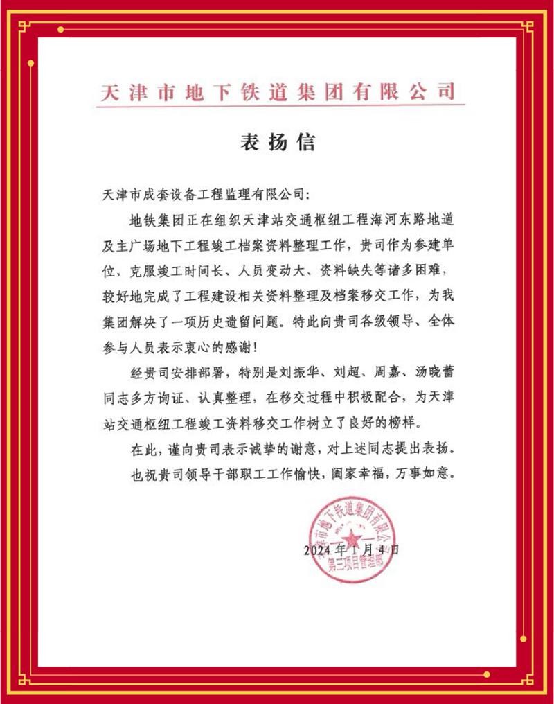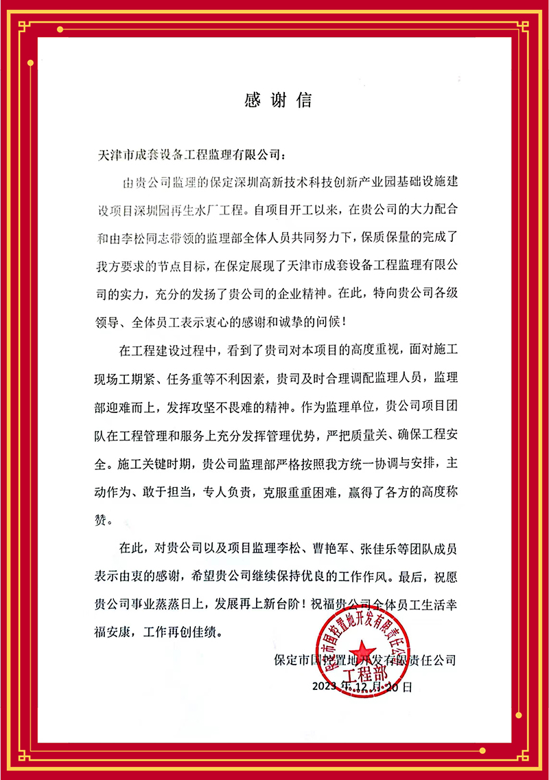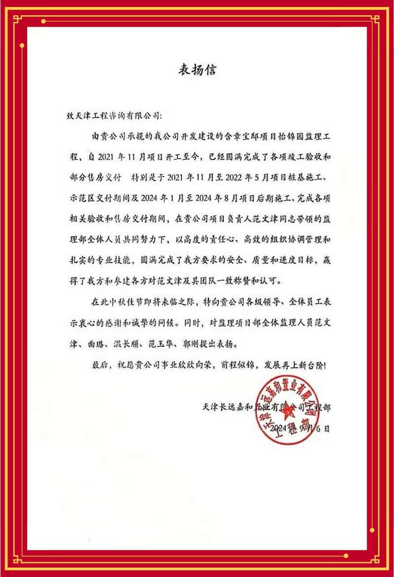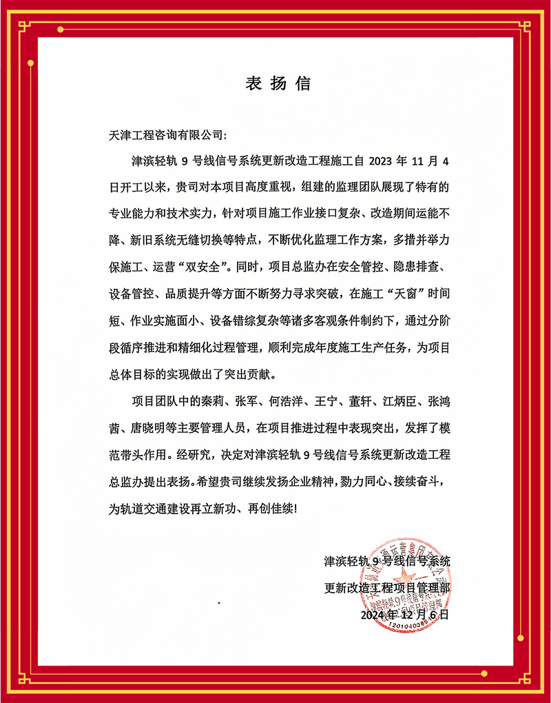 津?yàn)I輕軌9號(hào)線信號(hào)系統(tǒng)更新改造工程項(xiàng)目部感謝監(jiān)理團(tuán)隊(duì)多舉措解決項(xiàng)目施工作業(yè)接口復(fù)雜、改造期間運(yùn)能不降、新舊系統(tǒng)無縫切換等難題,力保施工、運(yùn)營(yíng)“雙安全”;天津長(zhǎng)遠(yuǎn)嘉和置業(yè)有限公司贊賞含璋寶坻項(xiàng)目怡錦園項(xiàng)目監(jiān)理團(tuán)隊(duì)以高度的責(zé)任心、高效的組織協(xié)調(diào)管理和扎實(shí)的專業(yè)技能推動(dòng)項(xiàng)目圓滿完成;天津華勘穂金房地產(chǎn)開發(fā)有限公司感謝監(jiān)理項(xiàng)目部主動(dòng)對(duì)接業(yè)主需求,有效管控質(zhì)量安全,切實(shí)保障施工進(jìn)度,很好地履行監(jiān)理職責(zé)......