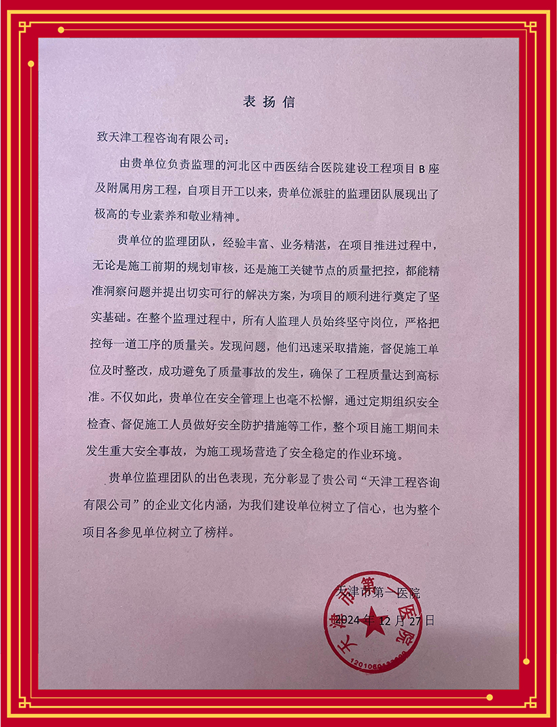 2024年,為持續(xù)深化“1264”戰(zhàn)略體系特別是“六化”舉措,加快推進(jìn)實(shí)體化進(jìn)程,天津咨詢順利完成吸收合并下屬成套監(jiān)理公司,在持續(xù)打造天津咨詢品牌,以工程監(jiān)理和項(xiàng)目管理為基礎(chǔ),發(fā)揮在項(xiàng)目建設(shè)期的綜合專業(yè)優(yōu)勢(shì),逐步形成“監(jiān)”“管”一體化服務(wù)模式方面邁出關(guān)鍵一步。近期,多家業(yè)主單位先后發(fā)來感謝信、表揚(yáng)信,對(duì)天津咨詢承擔(dān)工程建設(shè)監(jiān)理任務(wù)給予充分肯定。