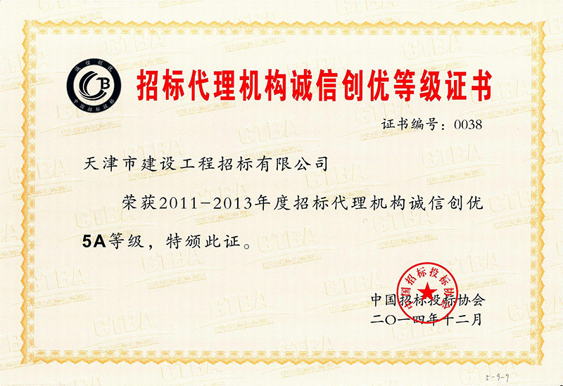 2011-2013年度招標(biāo)代理機(jī)構(gòu)誠信創(chuàng)優(yōu)5A等級